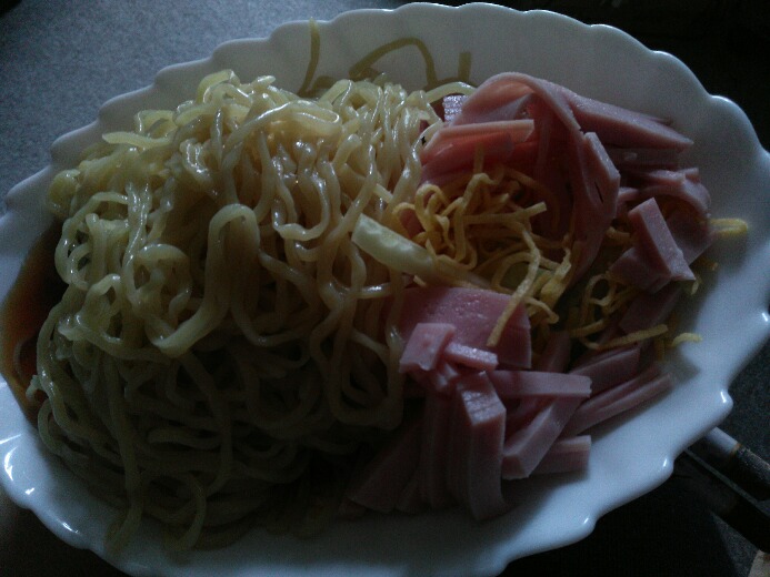 美味しくなさそうな盛り付けを!! ハムと麺の下にはちゃんと胡瓜と錦糸卵が有るのだがこの写真からは見えない。 盛り付けが壊滅的だが、 様は普通に喰えればOKという自分の適当さの賜物。 (でも仔犬は美味しいと言ってくれました) |