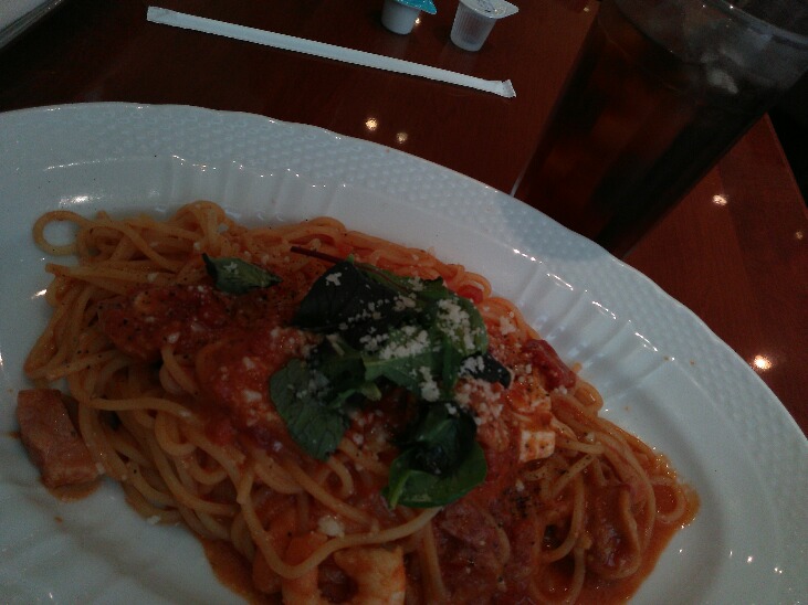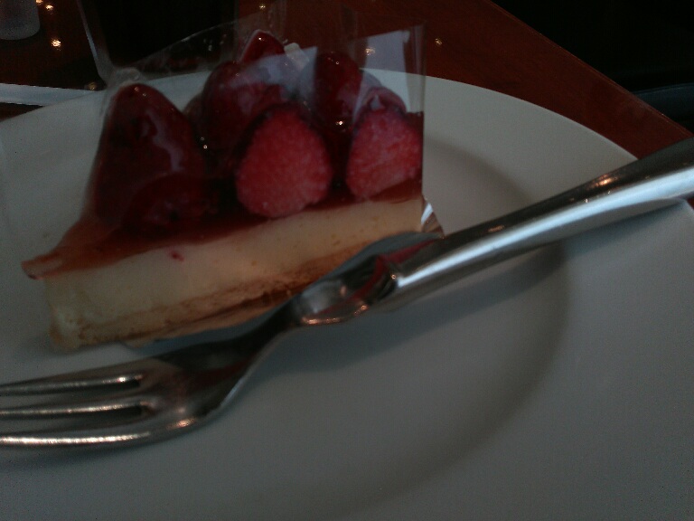 Cランチ1140円税別。1254円(税込)。 (スパゲッティー+ドリンク+ドルチェ) 海老とホタテとモッツァレラチーズのトマトクリームにしました。 単品だと430円もする苺のレアチーズです。 苺はやや酸っぱいがレアチーズはあまいので美味しいです。 |